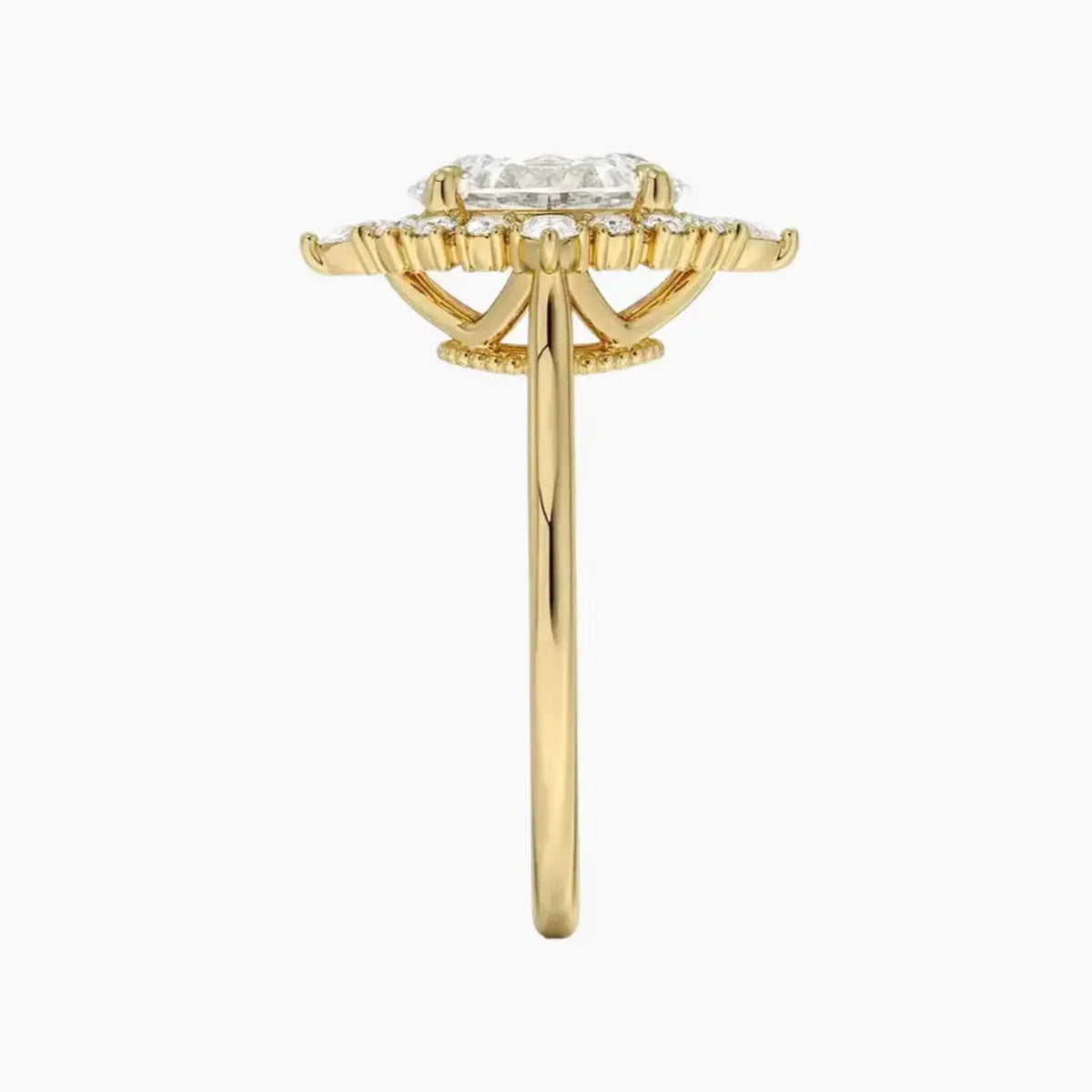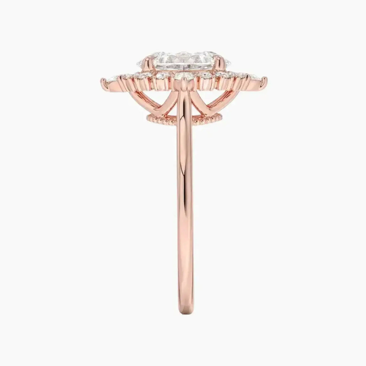 A botanical-themed array of circular and teardrop diamonds gracefully orbits the shining central diamond oval cut, set at cardinal points for a dazzling display.